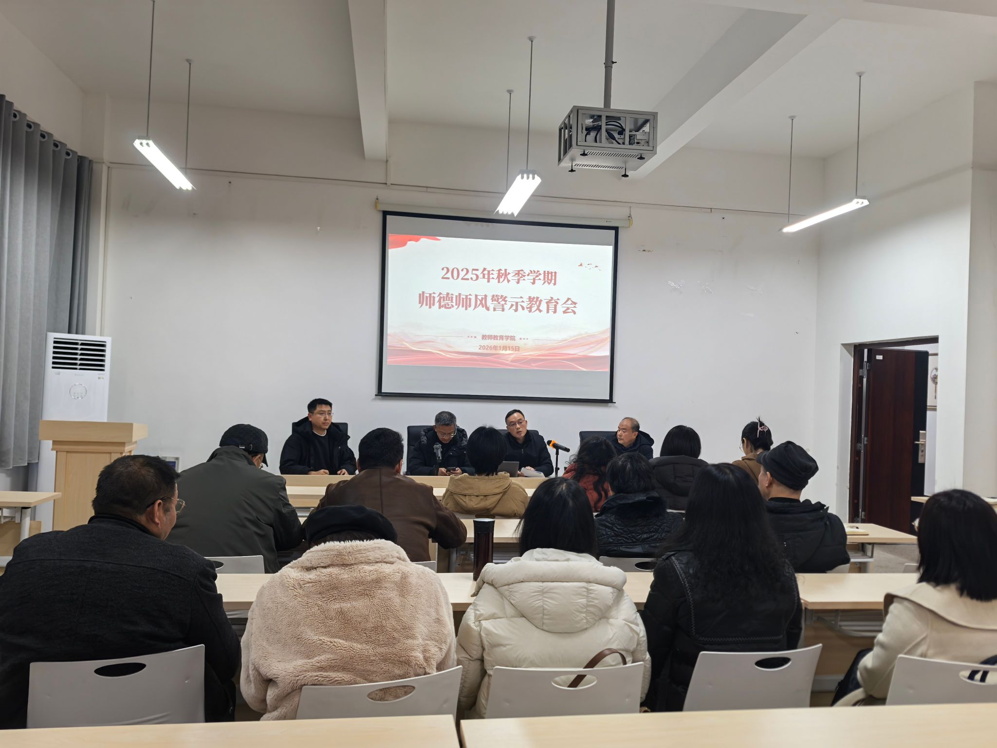 1月15日,教师教育学院在博学楼3栋138会议室召开师德师风警示教育会,会议由党总支书记鄢沛主持,全体教职工参加。