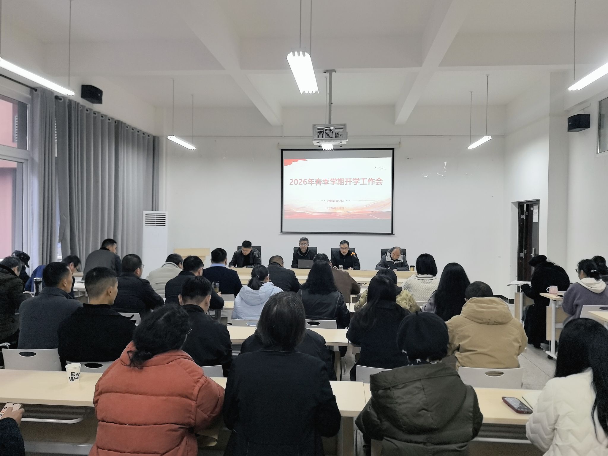 院长潘勇对寒假期间学院党建工作、专业监测、学科科研、安稳工作等进行了通报,并重点部署了学院2026年的工作任务。一是强化党建引领。以党的政治建设为统领,深化理论武装,推动党建与业务工作深度融合,不断发挥学院党组织的战斗堡垒作用。二是锚定根本任务。全面落实立德树人根本任务,为“十五五”建成库区高水平教师教育高地奠定坚实基础。三是建强师资队伍。实施“人才强院”战略,采取得力措施强化内培外引工作。四是聚焦学科建设。组建跨学科科研创新团队,重点围绕教育重点学科和博士立项建设,推动交叉学科融合创新。五是深化教学改革。强化教学组织建设,深化教学改革,推动教学质量稳步提升。六是提升育人质量。聚焦学生核心素养提升,强化招生就业指导与服务,全力推动学生就业与综合素质提升。